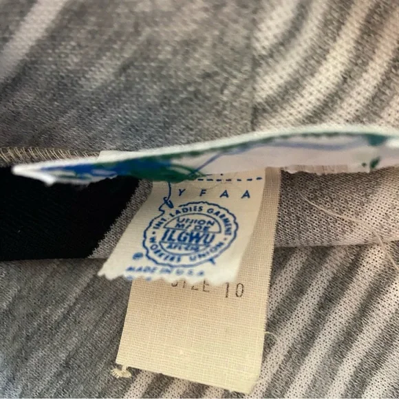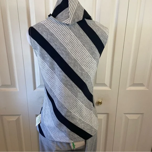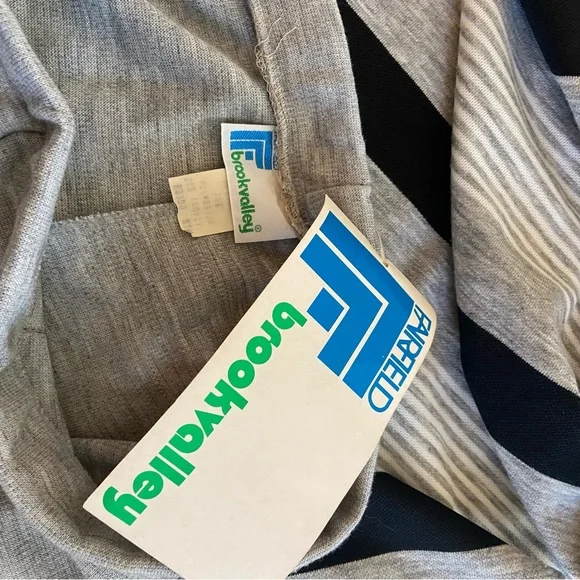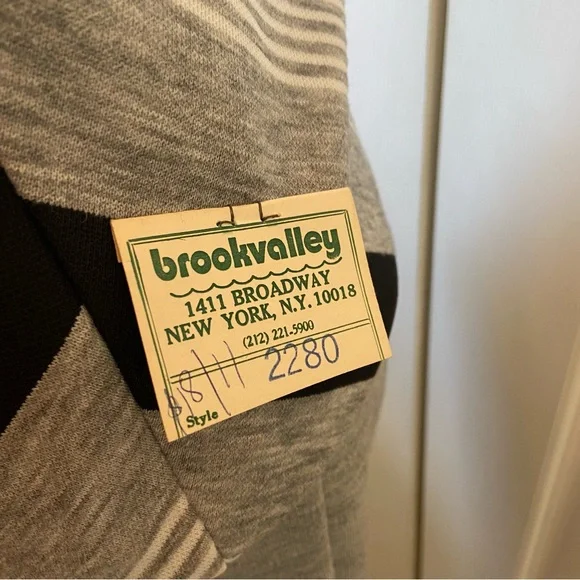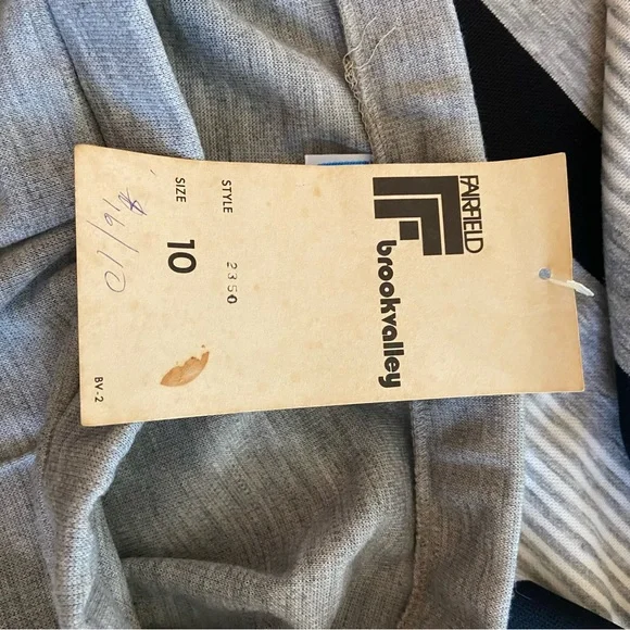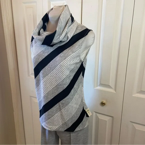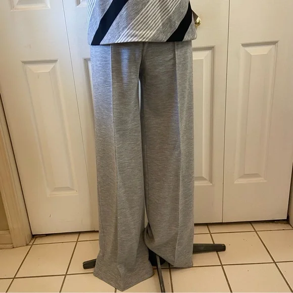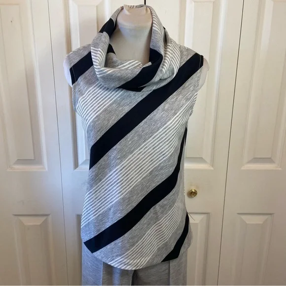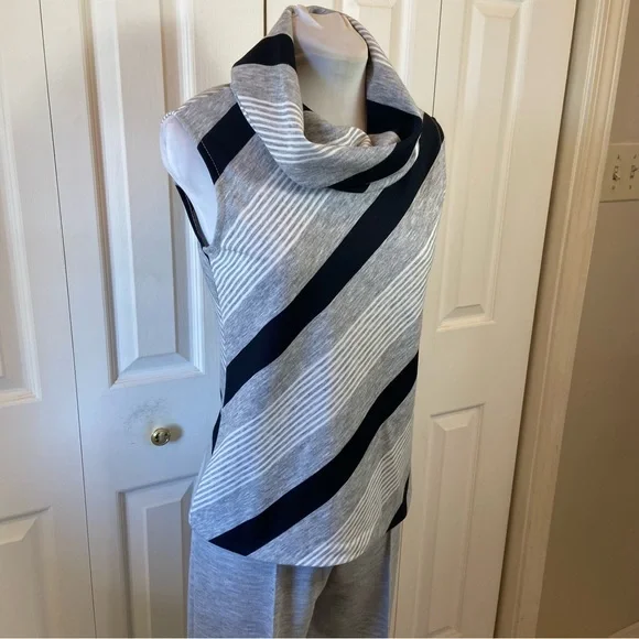 FABULOUS Vintage 60's 70's Cowl Neck Top Wide Leg Pant Suit "Dead Stock" with Tags sz 10Gray Black White Diagonal Stripe Cowl Neck Top and Wide Leg Gray Matching PantHas Original Tags.Top was priced at 18.00 Originally and Pants were Marked 16.00Acrylic and PolyesterDesigned by Fairfield BrookvalleyTop:Bust: 34"Waist: 32"Hip: 36"Length: 23.5"Pant: (Elastic Waist Un-Stretched)Waist: 29"Hip: 36"Inseam: 32.5Rise: 12.5"